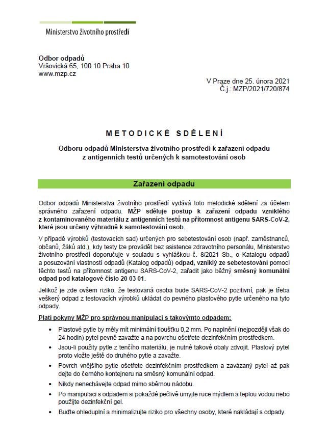 Sdělení MŽP, jak nakládat s použitými antigenními testy určenými k sebetestování osob. Tyto testy jsou považovány za směsný komunální odpad a je nutné je vyhazovat do nádoby na SKO zavázané v plastovém pytli o tloušťce min. 0,2 mm nebo dvojitém tenčím s dezinfikovaným povrchem, protože je zde riziko