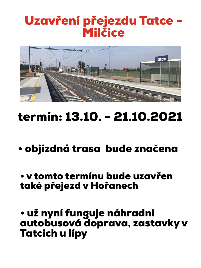 Uzavírka železničního přejezdu Tatce - Milčice od 13.10. - 21.10.2021 současně s uzavírkou přejezdu v Hořanech.