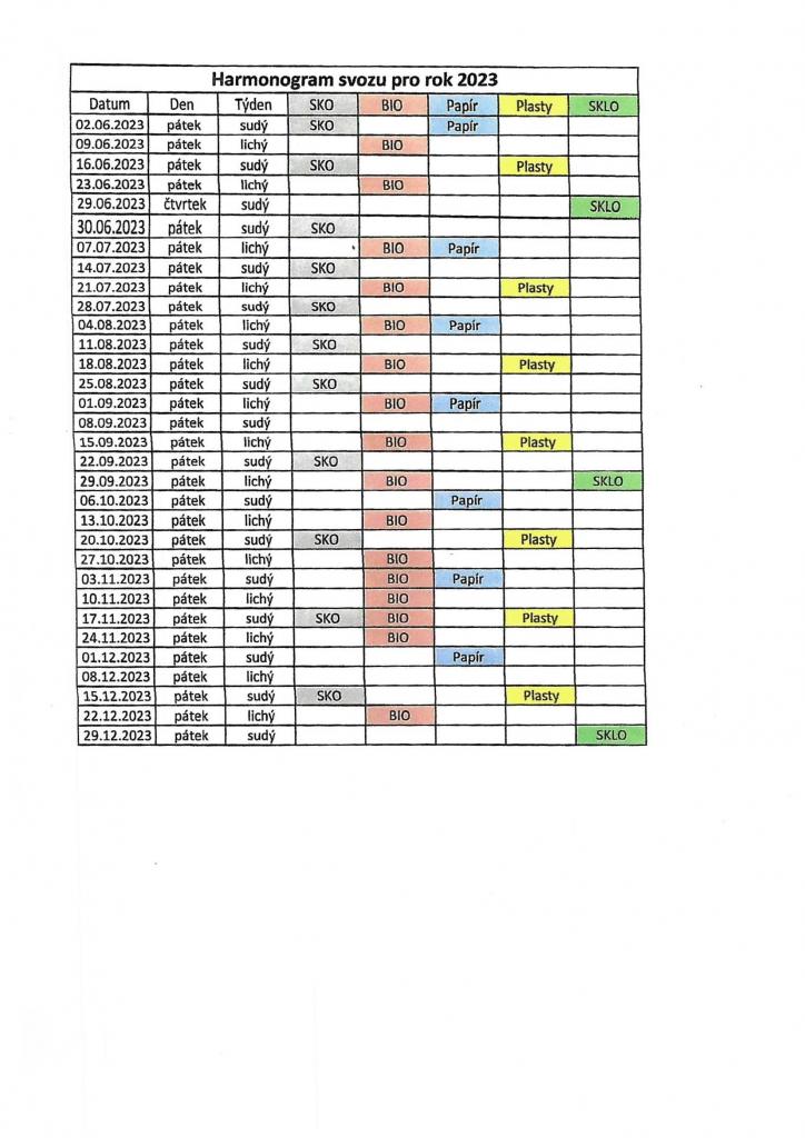 Nový harmonogra svozu odpadů pro 2023 platný od 02.06.2023