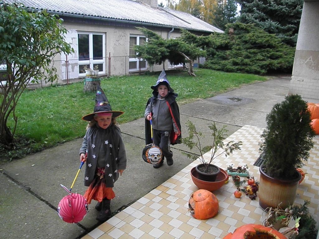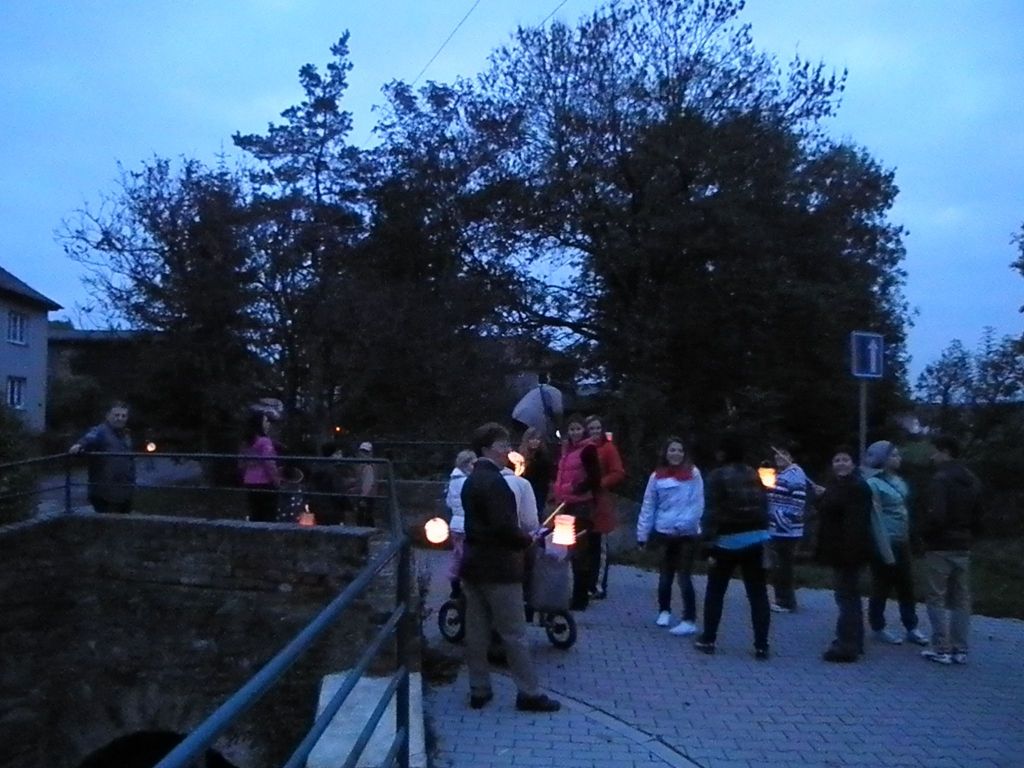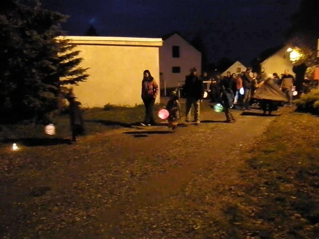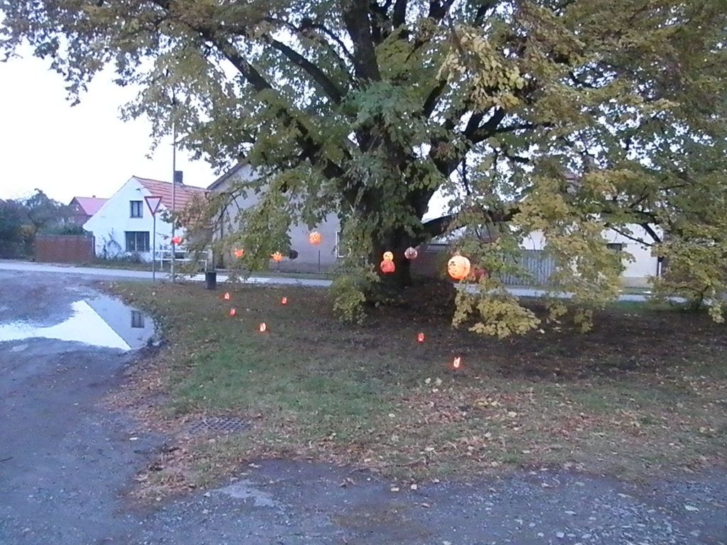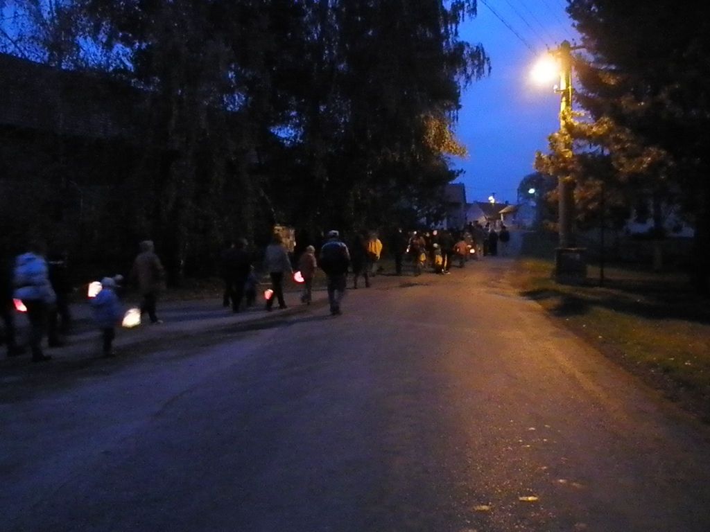 16:15 - začalo pro zájemce malování na obličej jako příprava pro lampionový průvod. Ale zájemců bylo tolik, že všichni nemohli být uspokojeni. Tak snad příště. Začatek průvodu jsme naplánovali na 17:00 hodin, ale to jsme se přepočítali, fakt ještě nebyla tma. Vyrazili jsme od školy asi v 17:45. Prošli jsme ulici Hořanskou, Prašnou, V Chaloupkách, Dlážděnou, Podedvorem, Kouřimskou a od Jednoty Hořanskou dolů k lípě. Hrubý odhad - 150 účastníků. Pro děti připravila škola a školka strašidelnou stezku v parku u Hampejzu.